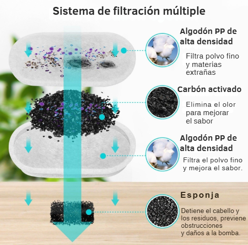 Nuestra fuente para gatos incorpora capas de algodón PP, carbón activado y esponja, que eliminan impurezas, malos olores, pelos y residuos. El resultado es agua más limpia, fresca y con mejor sabor, cuidando la salud de tu gato y protegiendo la bomba para una mayor durabilidad.